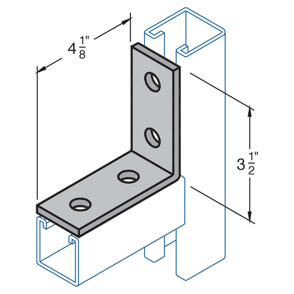 H-STRUT General Fittings are designed to fit with all H-STRUT 1-5/8" wide channels. All H-STRUT fittings are manufactured from 1/4" thick carbon steel, 1-5/8" wide, all holes are 9/16" diameter, spaced 1-7/8" on center and 13/16" from the end.