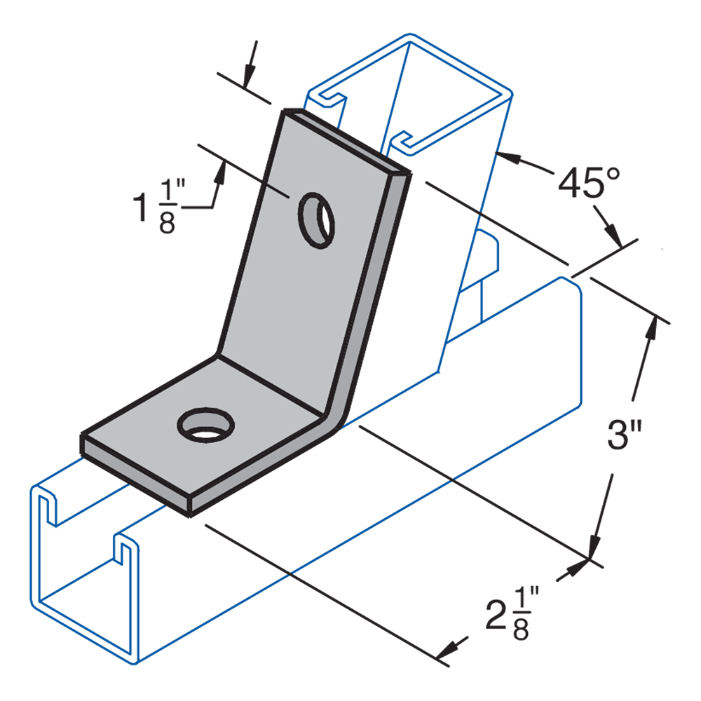 H-STRUT General Fittings are designed to fit with all H-STRUT 1-5/8" wide channels. All H-STRUT fittings are manufactured from 1/4" thick carbon steel, 1-5/8" wide, all holes are 9/16" diameter, spaced 1-7/8" on center and 13/16" from the end.
