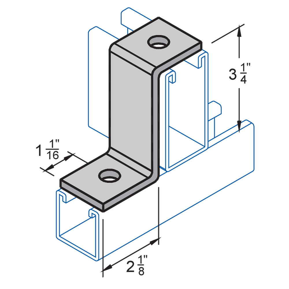 H-STRUT General Fittings are designed to fit with all H-STRUT 1-5/8" wide channels. All H-STRUT fittings are manufactured from 1/4" thick carbon steel, 1-5/8" wide, all holes are 9/16" diameter, spaced 1-7/8" on center and 13/16" from the end.