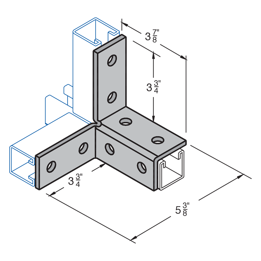 H-STRUT General Fittings are designed to fit with all H-STRUT 1-5/8" wide channels. All H-STRUT fittings are manufactured from 1/4" thick carbon steel, 1-5/8" wide, all holes are 9/16" diameter, spaced 1-7/8" on center and 13/16" from the end.