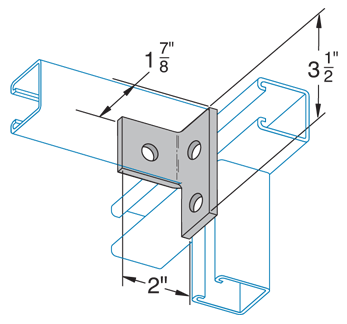 H-STRUT General Fittings are designed to fit with all H-STRUT 1-5/8" wide channels. All H-STRUT fittings are manufactured from 1/4" thick carbon steel, 1-5/8" wide, all holes are 9/16" diameter, spaced 1-7/8" on center and 13/16" from the end.