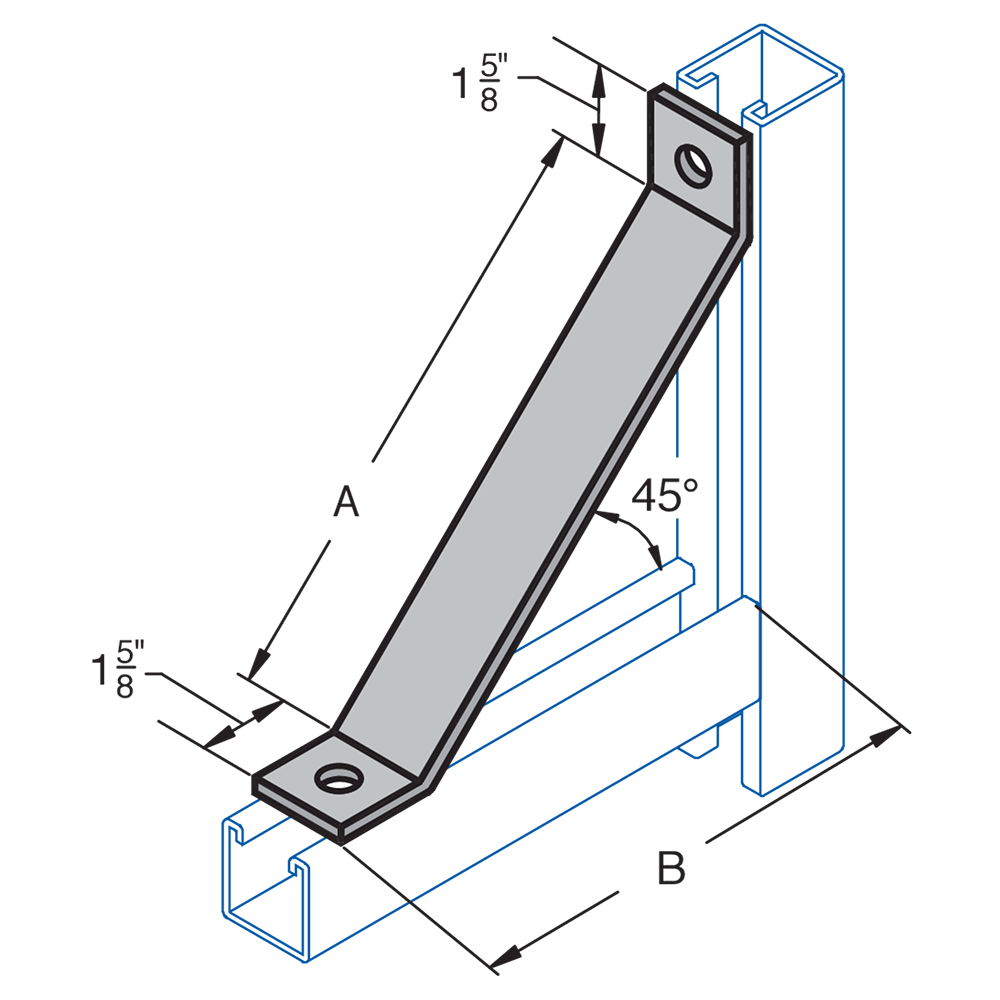 H-STRUT General Fittings are designed to fit with all H-STRUT 1-5/8 wide channels. All H-STRUT fittings are manufactured from 1/4 thick carbon steel, 1-5/8 wide, all holes are 9/16 diameter, spaced 1-7/8 on center and 13/16 from the end.