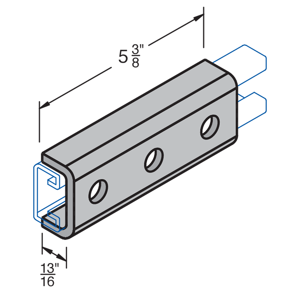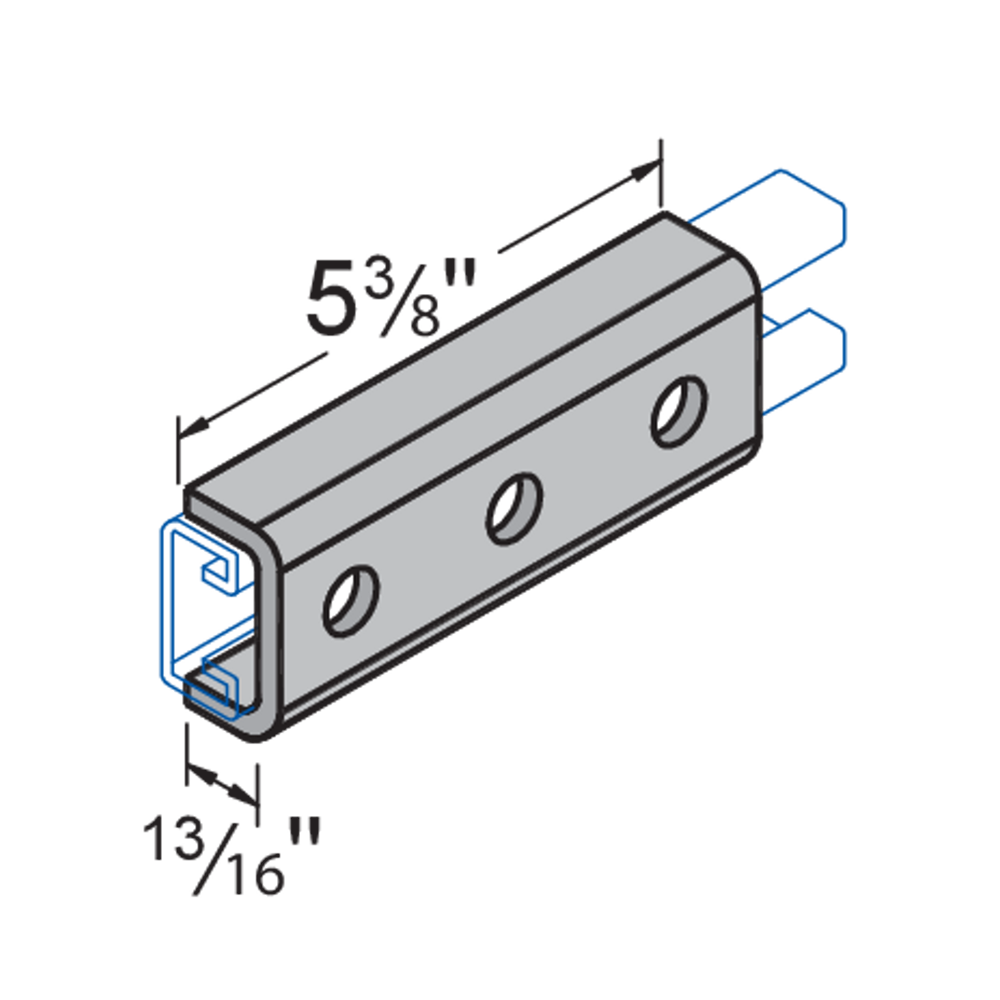 H-STRUT General Fittings are designed to fit with all H-STRUT 1-5/8" wide channels. All H-STRUT fittings are manufactured from 1/4" thick carbon steel, 1-5/8" wide, all holes are 9/16" diameter, spaced 1-7/8" on center and 13/16" from the end.