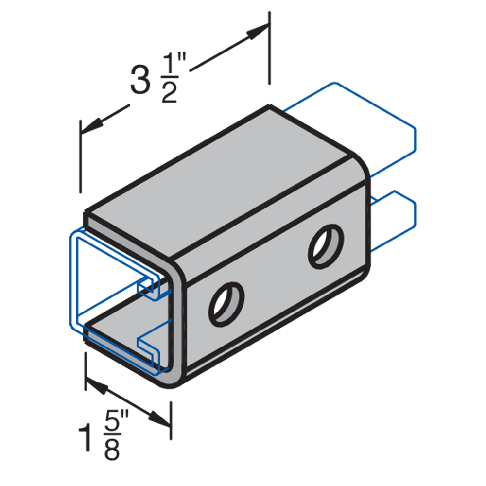 H-STRUT General Fittings are designed to fit with all H-STRUT 1-5/8" wide channels. All H-STRUT fittings are manufactured from 1/4" thick carbon steel, 1-5/8" wide, all holes are 9/16" diameter, spaced 1-7/8" on center and 13/16" from the end.
