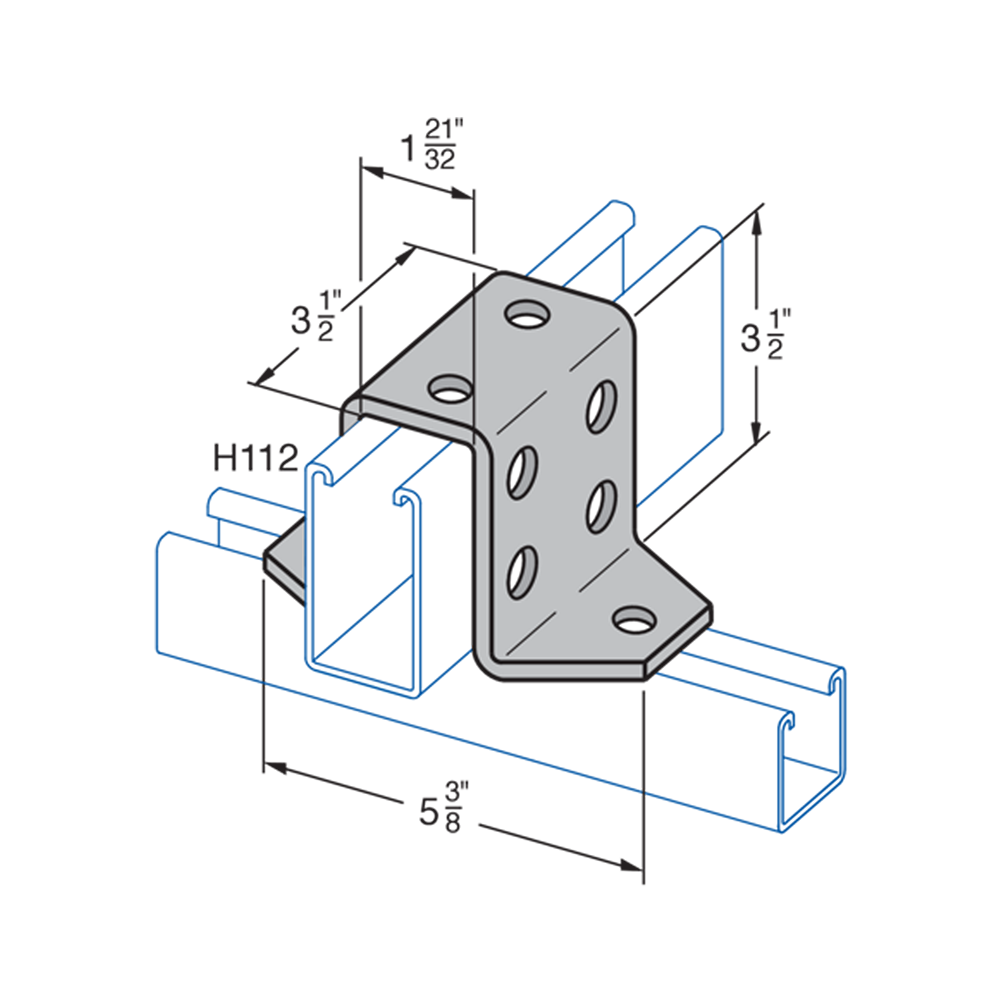 H-STRUT General Fittings are designed to fit with all H-STRUT 1-5/8" wide channels. All H-STRUT fittings are manufactured from 1/4" thick carbon steel, 1-5/8" wide, all holes are 9/16" diameter, spaced 1-7/8" on center and 13/16" from the end.