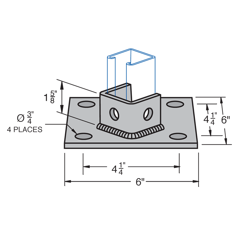H-STRUT General Fittings are designed to fit with all H-STRUT 1-5/8" wide channels. All H-STRUT fittings are manufactured from 1/4" thick carbon steel, 1-5/8" wide, all holes are 9/16" diameter, spaced 1-7/8" on center and 13/16" from the end.