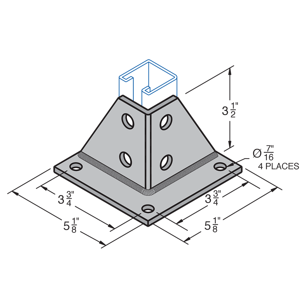 H-STRUT General Fittings are designed to fit with all H-STRUT 1-5/8" wide channels. All H-STRUT fittings are manufactured from 1/4" thick carbon steel, 1-5/8" wide, all holes are 9/16" diameter, spaced 1-7/8" on center and 13/16" from the end.