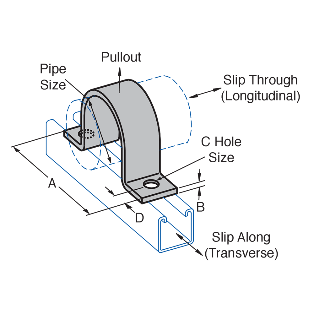 H-STRUT Pipe Hold-Down Two-Hole Strut Straps are all manufactured to fit into the standard openings of 1-5/8" channel to support runs of piping where desired, to secure the pipe in place.