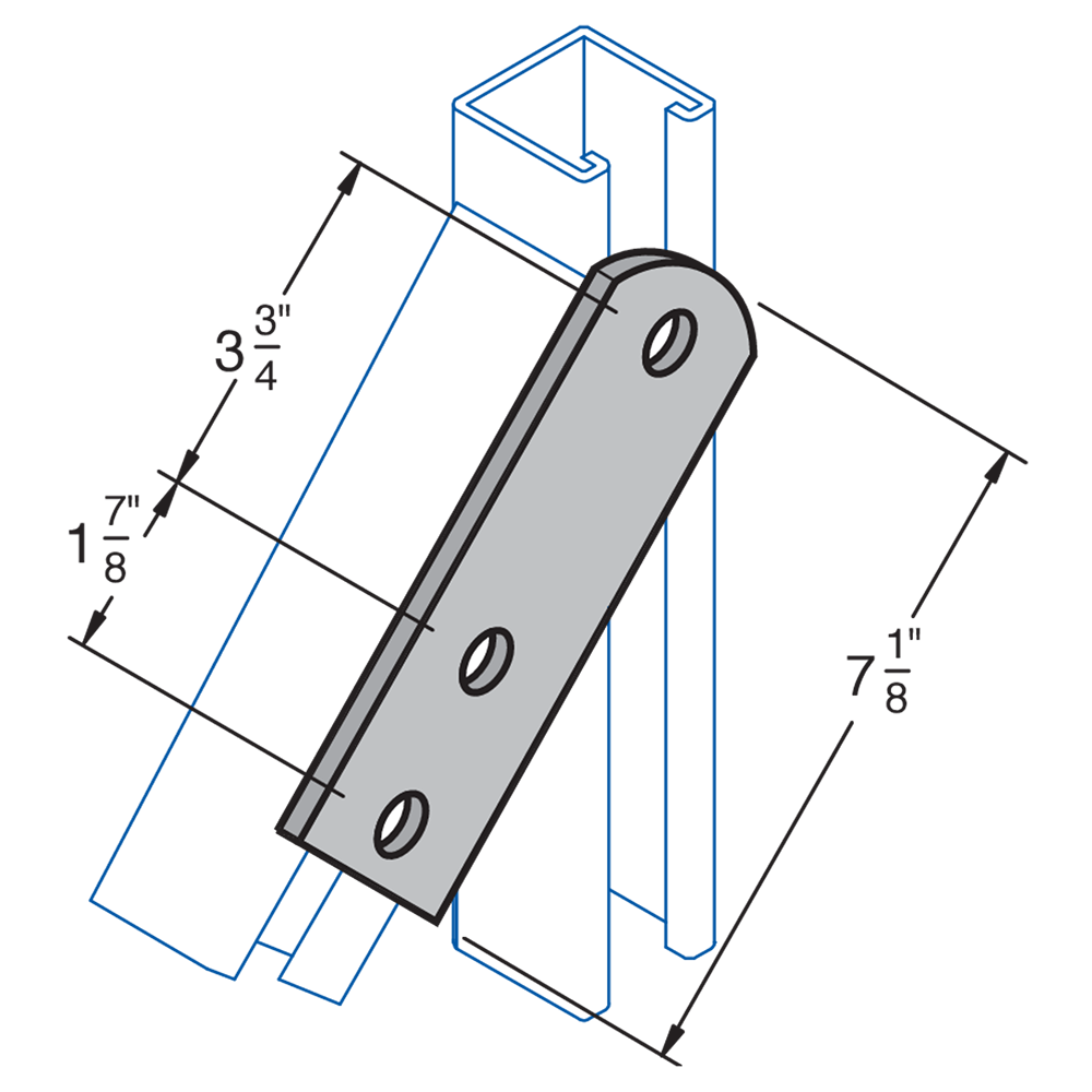 H-STRUT General Fittings are designed to fit with all H-STRUT 1-5/8" wide channels. All H-STRUT fittings are manufactured from 1/4" thick carbon steel, 1-5/8" wide, all holes are 9/16" diameter, spaced 1-7/8" on center and 13/16" from the end.