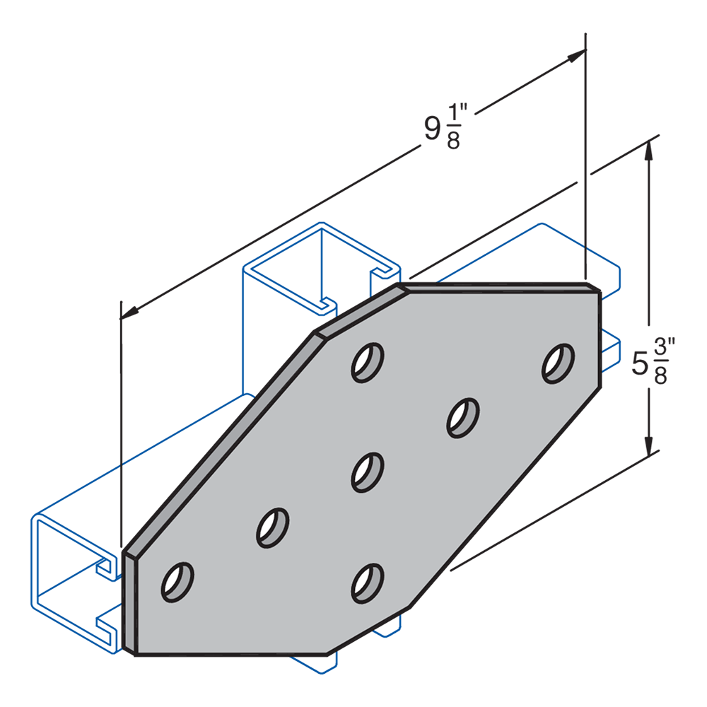 H-STRUT General Fittings are designed to fit with all H-STRUT 1-5/8" wide channels. All H-STRUT fittings are manufactured from 1/4" thick carbon steel, 1-5/8" wide, all holes are 9/16" diameter, spaced 1-7/8" on center and 13/16" from the end.