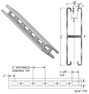 Channel combinations of two or more elements are spot welded together to form multiple combinations. Welds are placed two inches on center throughout the length of the sections.