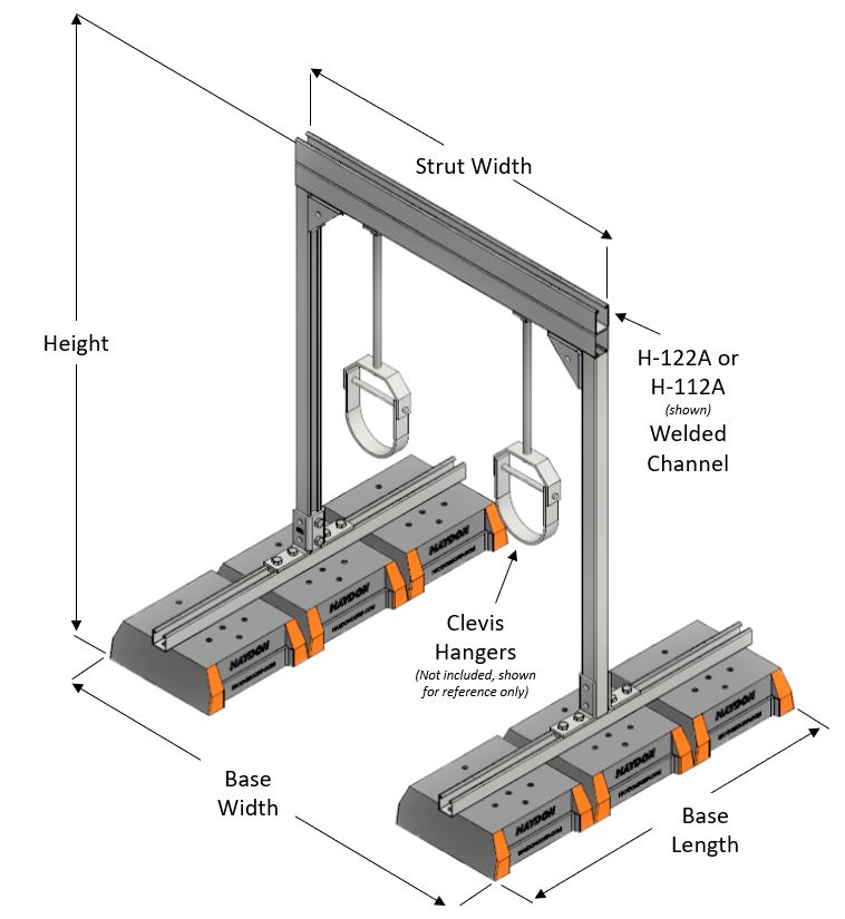 | Model No. | Height | Strut Width | Base Width | Base Length | No. of Bases | Weight (lbs) | Uniform Load Capacity (lbs) | Safety Factor |