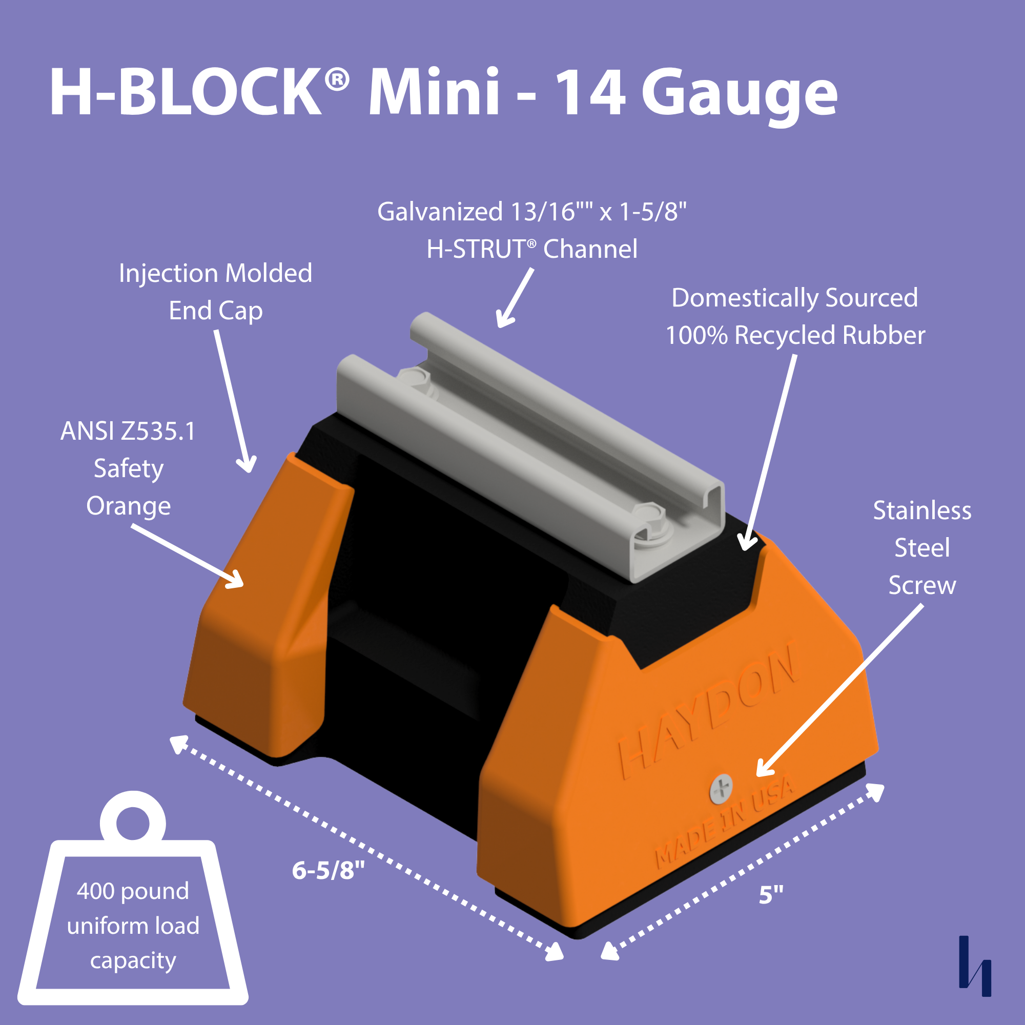 H-Block Mini Rooftop Support Series is designed specifically for single pipe supporting. The H-Block Mini Series with H-164 has 13/16" pre-galvanized steel channel and is UV resistant and suitable for installation on most types of roofing material or other flat surfaces.