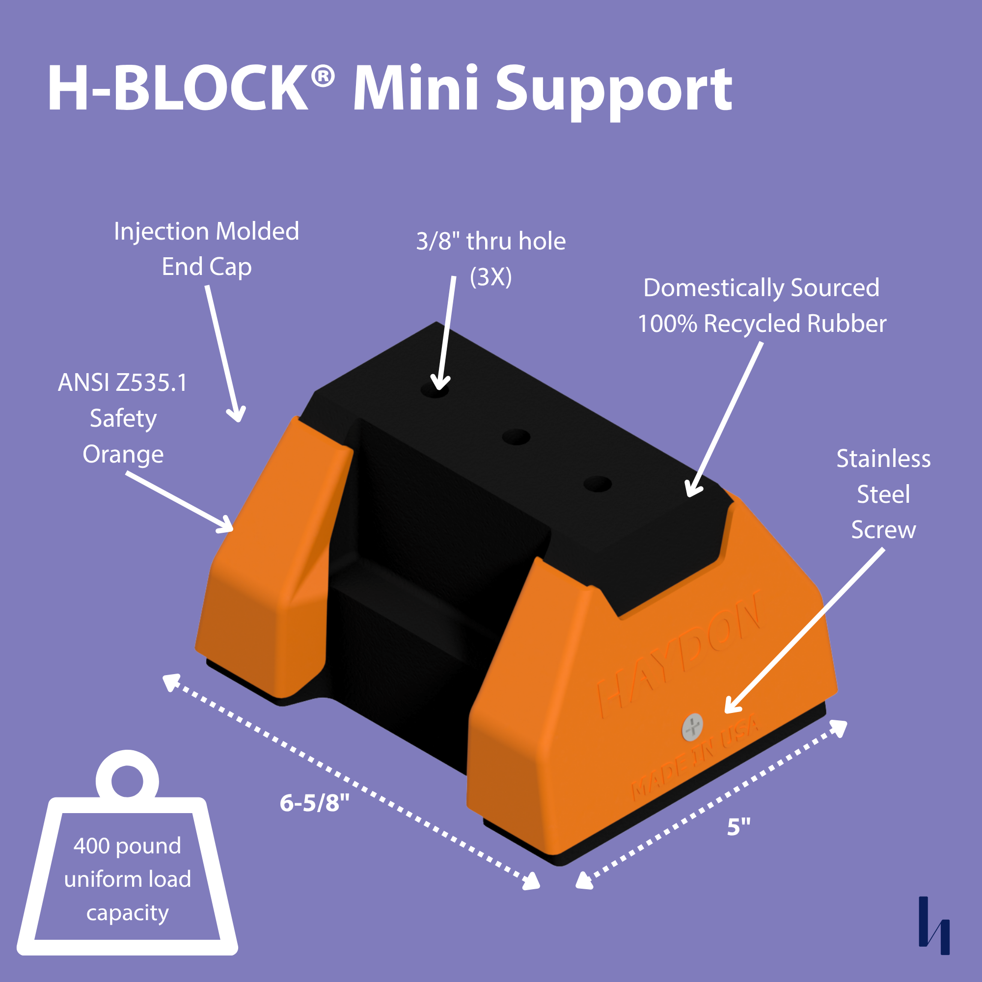 The H-Block Mini is designed specifically for supporting single piping. Made in the USA, the mini block is UV resistant and manufactured utilizing 100% recycled rubber. It has no roof penetration, is suitable for installation on most types of roofing material or other flat surfaces and comes pre-assembled.