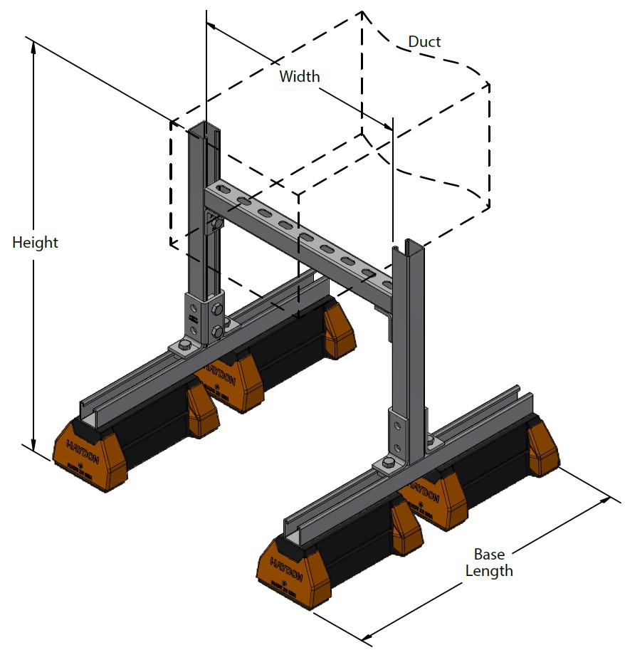 The H-Block DSFW series is designed specifically for supporting ductwork with an adjustable height to meet project needs. This product has a fixed cross beam available in different sizes to support ducts up to 48" in width. Ducts can be attached to the strut frame using sheet metal screws, brackets or straps. The bases are made from recycled rubber and are suitable for installation on most types of roofing materials. All hardware required for assembly is included. H-Block Standard DSFW comes with four bases, cross beams and 12-gauge channel 1-5/8" H-132-OS.