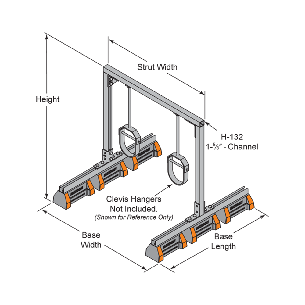 | Model No. | Height | Strut Width | Base Width | Base Length | No. of Bases | Weight (lbs) | Uniform Load Capacity (lbs) | Safety Factor |