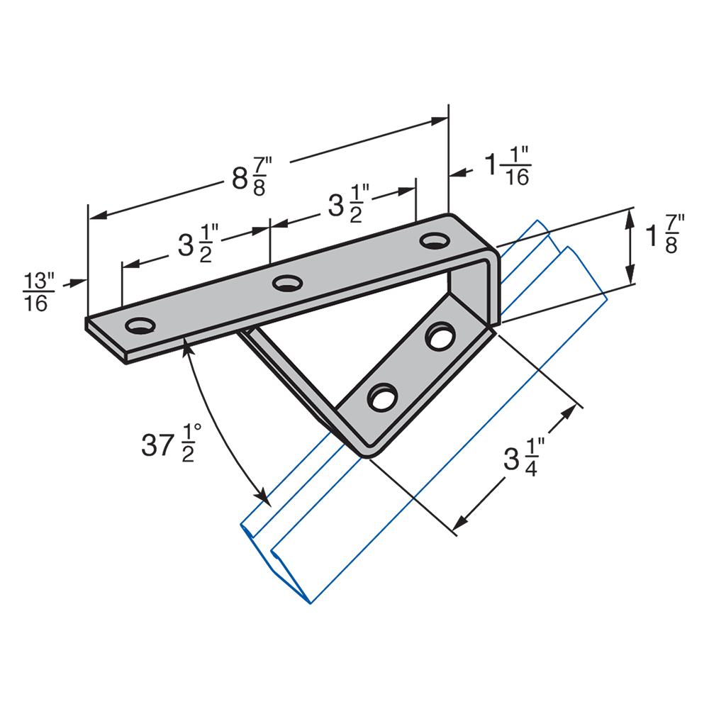 H-STRUT General Fittings are designed to fit with all H-STRUT 1-5/8" wide channels. All H-STRUT fittings are manufactured from 1/4" thick carbon steel, 1-5/8" wide, all holes are 9/16" diameter, spaced 1-7/8" on center and 13/16" from the end.