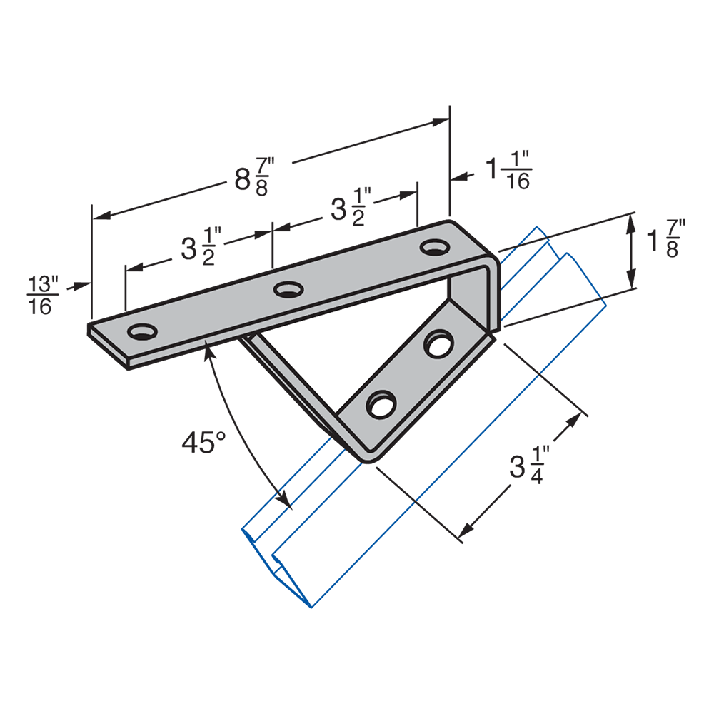 H-STRUT General Fittings are designed to fit with all H-STRUT 1-5/8" wide channels. All H-STRUT fittings are manufactured from 1/4" thick carbon steel, 1-5/8" wide, all holes are 9/16" diameter, spaced 1-7/8" on center and 13/16" from the end.